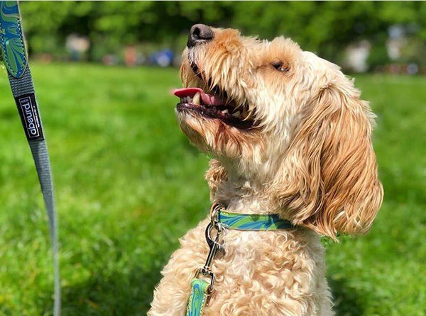 Save 20% when you buy an Absurd Design patterned leather dog collar together with a webbing lead. The leather collar and leather details on the leash are individually marbled with bright colourful patterns - no two are ever the same! Handmade in the UK using quality leather and traditionally hand-stitched for a durable and long lasting matching set.